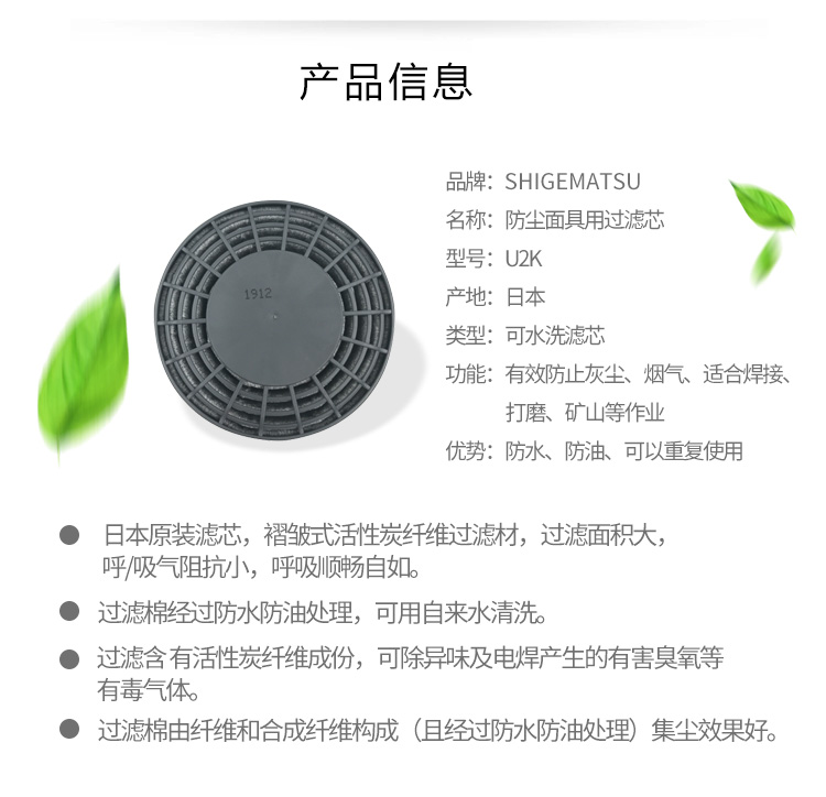 SHIGEMATSU/日本重松制作所防塵面具用過濾芯U2K防灰塵煙氣適合焊接打磨礦山作業(yè)